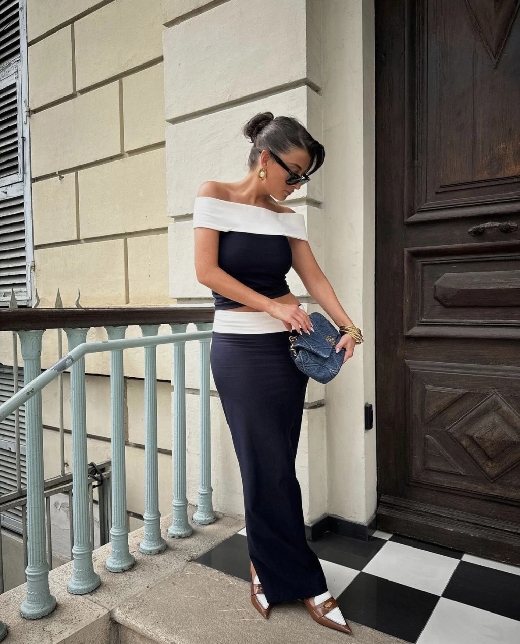 el Conjunto Lula, una prenda que combina dos colores en un contraste espectacular, ideal para resaltar tu belleza en cualquier ocasión. Este conjunto cuenta con hombros descubiertos, brindando un aire fresco y sofisticado a tu look.